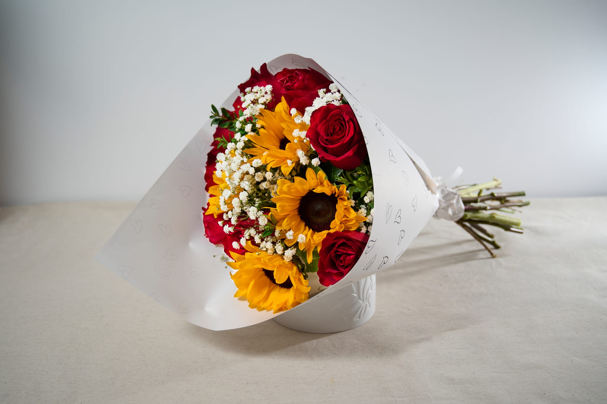 El Ramo Destello de amor es una composición vibrante que combina la calidez de los girasoles con la elegancia clásica de las rosas rojas. Los tonos amarillos llenos de luz se mezclan con el rojo intenso, creando un contraste lleno de vida, amor y optimismo. Acompañado de delicadas flores blancas y verdes frescos, este ramo transmite alegría, cariño y emociones profundas, convirtiéndose en el detalle perfecto para celebrar momentos especiales o sorprender a alguien importante.
